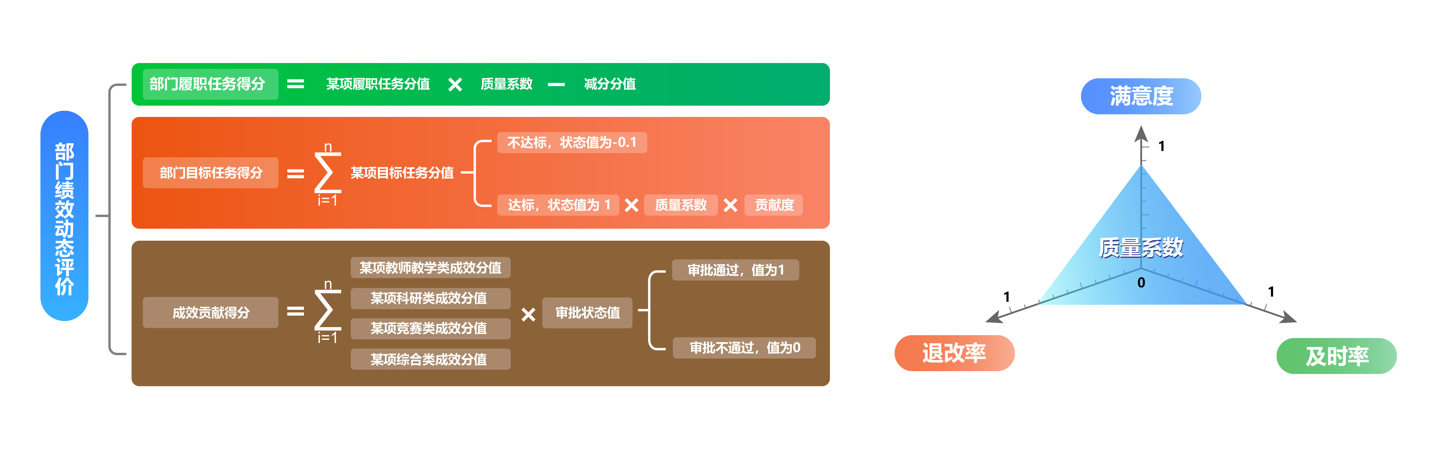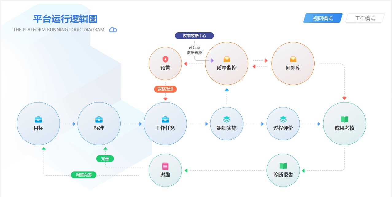 为使学校管理体制实现常态化运行,山东劳动职业技术学院设计了基于任务行为数据的质量评价模型,构建出集任务及时率、退改率、满意度为一体的三维坐标模型,通过独立测量、相互关联、整体测算,实现面向任务的过程性质量评价。针对传统考核机制中任务难监测、过程不透明的问题,运用现代信息技术设计开发智能化质量管理平台,通过采集、分析、监测、反馈等功能,提高学校现代化管理效率。