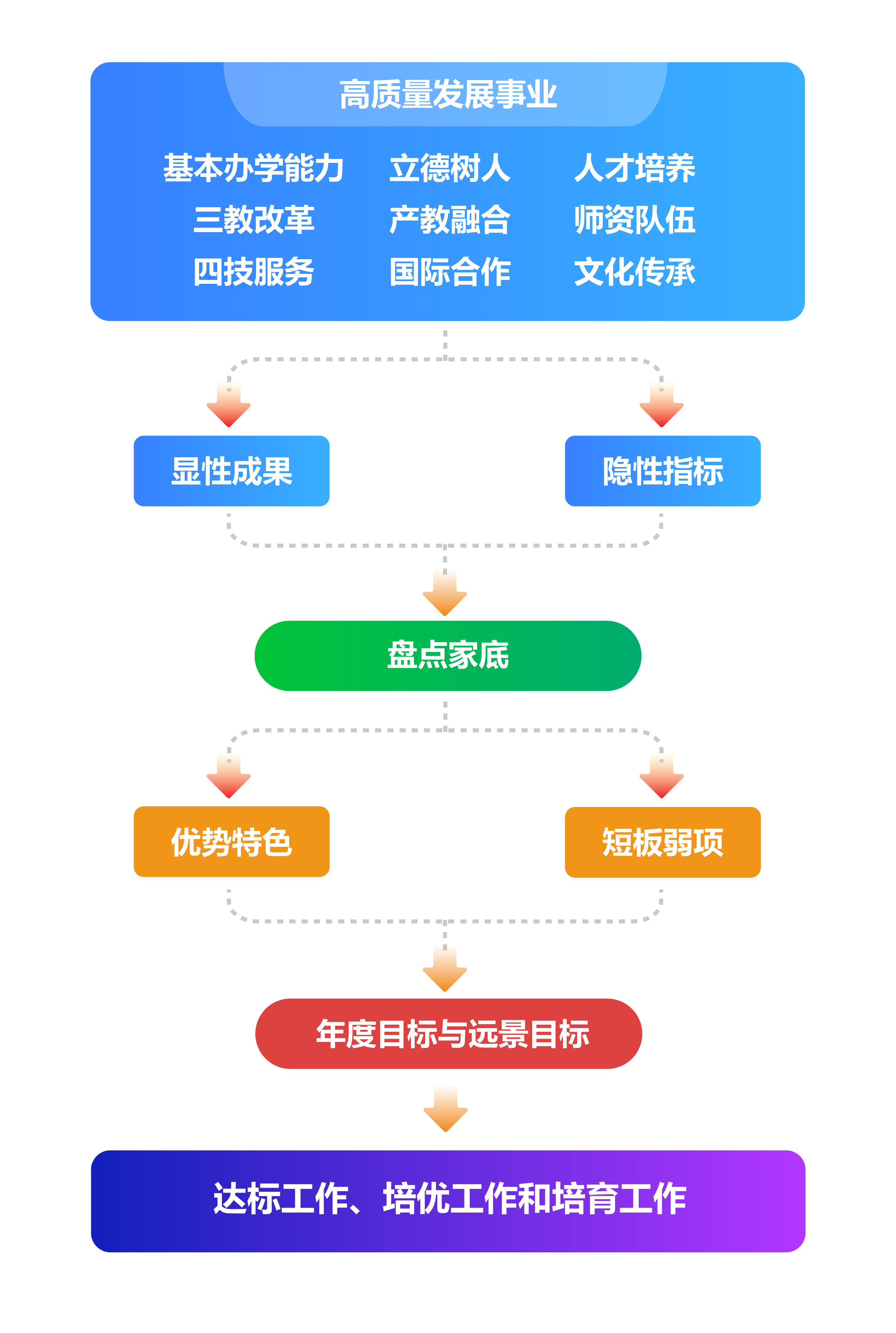 山东劳动职业技术学院吸收、借鉴现代管理学的先进成果和工具,运用OKR目标与关键成果法,将人才培养、产教融合、师资队伍、社会服务、国际合作交流等反映和影响办学质量的显性成果和隐性指标,转化成提升办学质量的年度达标工作、培优工作和培育工作。