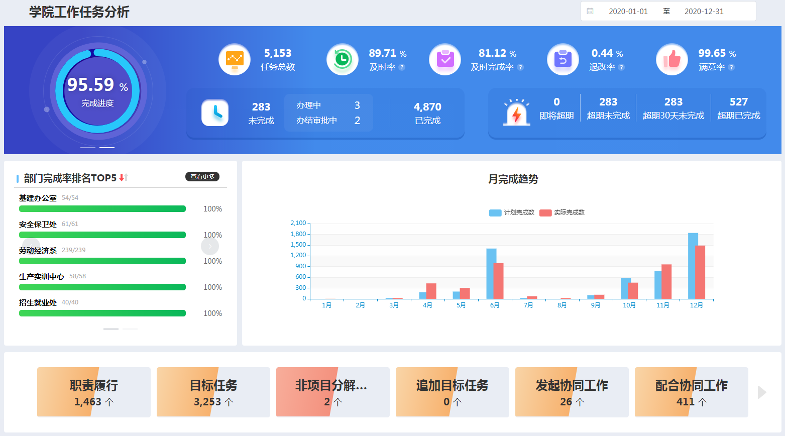针对传统考核机制中工作质量难评价、工作过程难监测等问题,山东劳动职业技术学院设计了三类考核任务:一是常规性工作设定统一分值上限,作为职责履行类纳入考核;二是年初制定的达标工作、培优工作和培育工作,根据任务难度和基础设定分值,作为目标任务类纳入考核;三是教育教学成果与表彰获奖,按照考核办法审核计分,作为成效贡献类纳入考核。通过诊改的工作原理和方法,山东劳动职业技术学院形成了目标体系构建、目标任务分解、任务过程监测、绩效动态排名的完整考核机制链条。